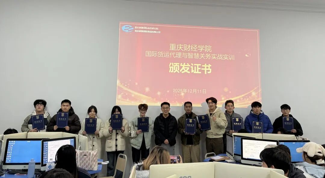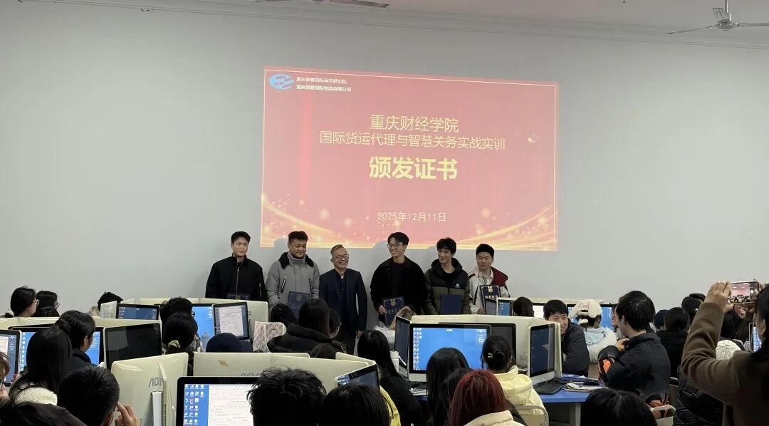2025年12月11日,由重庆共勤教育科技有限公司与重庆财经学院物流工程学院(国际商学院)联合举办的“国际货运代理与智慧关务实战实训项目”在该校教学楼1609教室顺利结课,并于当日举行结训仪式。重庆新雅国际物流有限公司董事长兼重庆新雅国际商务研究院理事长陈安庆、重庆新雅供应链管理有限公司总经理陈哲,重庆格美报关服务有限公司总经理焦琳等企业代表出席结训仪式。